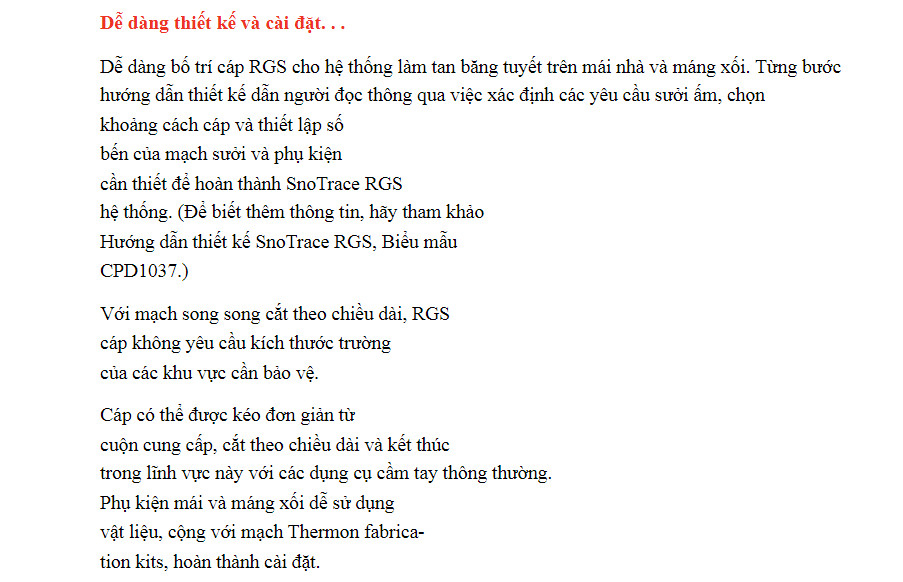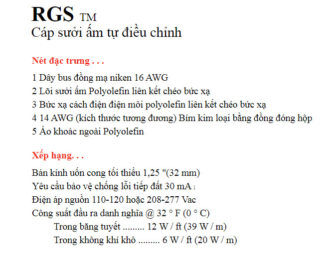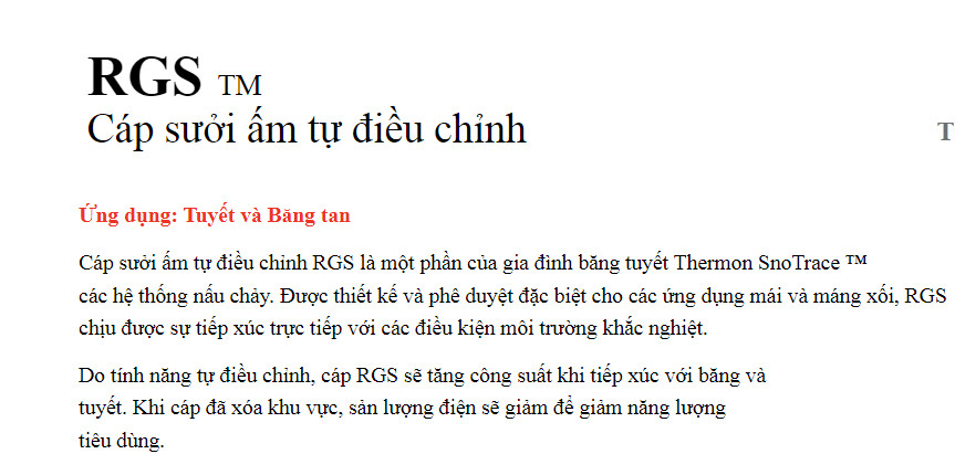 Cáp sưởi ấm tự điều chỉnh THERMON RGS là một phần của dòng hệ thống làm tan băng tuyết Thermon SnoTrace ™. Được thiết kế và phê duyệt đặc biệt cho các ứng dụng mái và máng xối, RGS chịu được sự tiếp xúc trực tiếp với các điều kiện môi trường khắc nghiệt. Do có tính năng tự điều chỉnh, cáp RGS sẽ tăng công suất khi tiếp xúc với băng và tuyết. Khi cáp đã xóa khu vực, sản lượng điện sẽ giảm để giảm tiêu thụ năng lượng. Dễ dàng bố trí cáp RGS cho hệ thống làm tan băng tuyết trên mái nhà và máng xối. Hướng dẫn thiết kế từng bước dẫn dắt người đọc thông qua việc xác định các yêu cầu sưởi ấm, chọn khoảng cách cáp và thiết lập số lượng mạch sưởi và phụ kiện cần thiết để hoàn thành hệ thống SnoTrace THEMRON RGS.