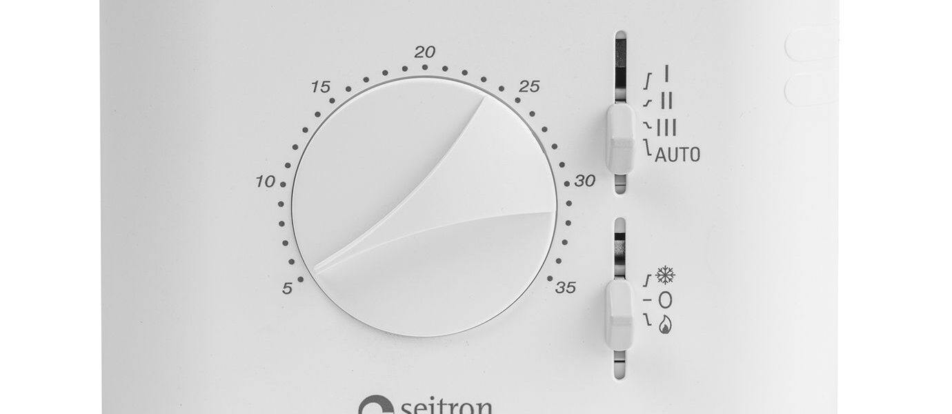 Electronic fan coil unit thermostat DIAMOND NEW LINE with heating/off/cooling selector and manual or automatic three-speed selector. Operation with 2 or 4 tubes and anti-stratification function. Operation with internal sensor, remote sensor or with “cutoff thermostat”. Input for connecting a window contact. By means of the mechanical pins the angle of rotation of the knob can be limited.
